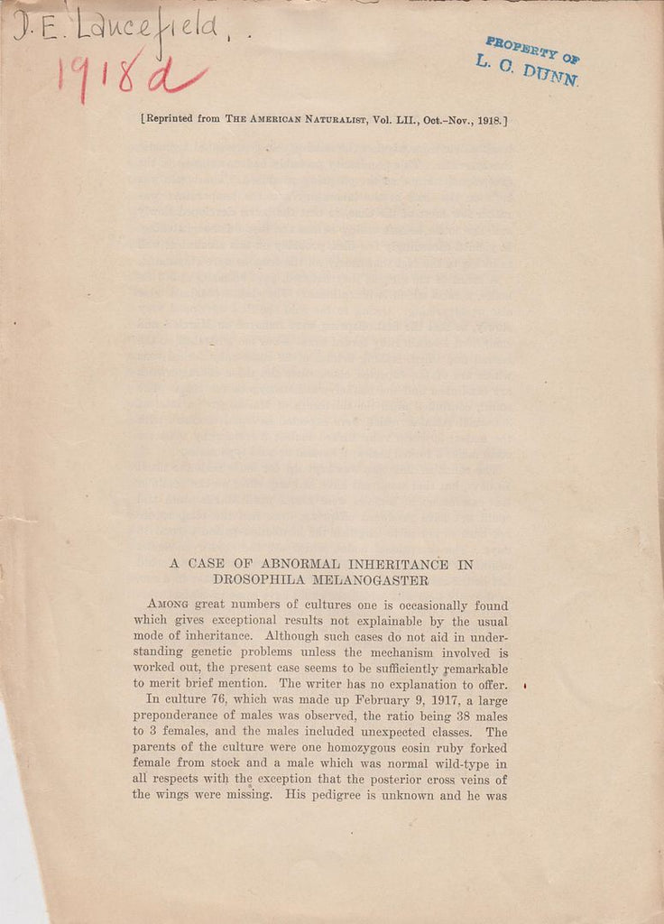 Very good condition. First edition. Offprint. Original wrappers. Ownership stamp of L.C. Dunn on title page. Science. Biology. Edges are nicked.* |