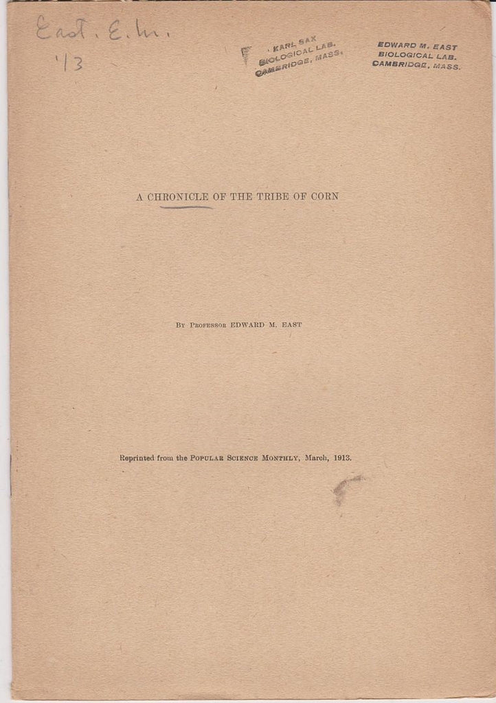 Description 1913. Reprinted from the Popular Science Monthly, March 1913. Ownership stamp: Edward M. East, Biological Lab, Cambridge Mass. First separate edition. Offprint. Original wrappers.*
