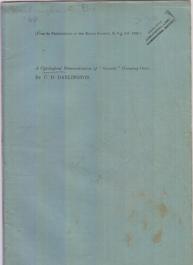 Reprinted from Proceedings of the Royal Society, B, Vol. 107. 1930. Ownership stamp of Karl Sax Biological Laboratory. First separate edition. Offprint. Original Wrappers. * |