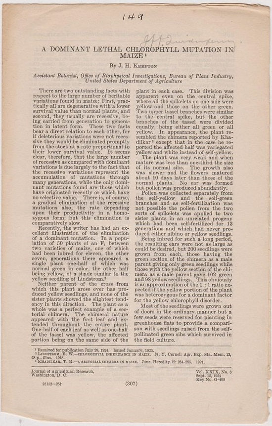 Description 1924. Reprinted from Journal of Agricultural Research, Vol.l XXIX, No. 6, pp. 307-309. Ownership signature: J.H. Quisenberry. First separate edition. Offprint. Original wrappers. *
