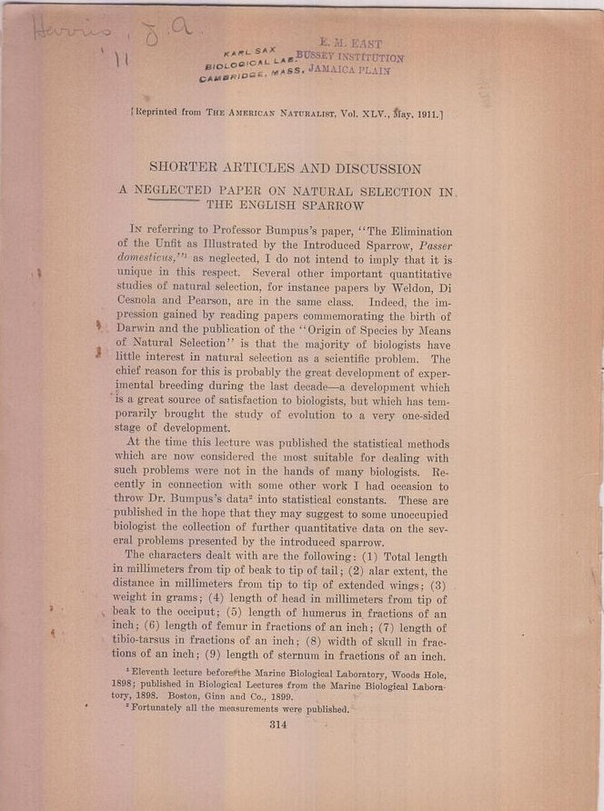 Reprinted from The American Naturalist, Vol. XLV, May 1911. Ownership stamp of Karl Sax and EM East. First separate edition. Offprint. Original wrappers. * |