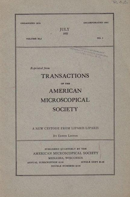American Microscopical Society, July 1922, Vol. XLI, No. 3, pp. 118-121 Dept. of Zoology stamp front cover else very good. * Science. Biology. Zoology. "Edwin Linton (1855-1939) was an American biologist noted for his research in the field of helminthology, the study of worms, especially parasitic worms in fishes." Wikipedia Offprint. First edition. |
