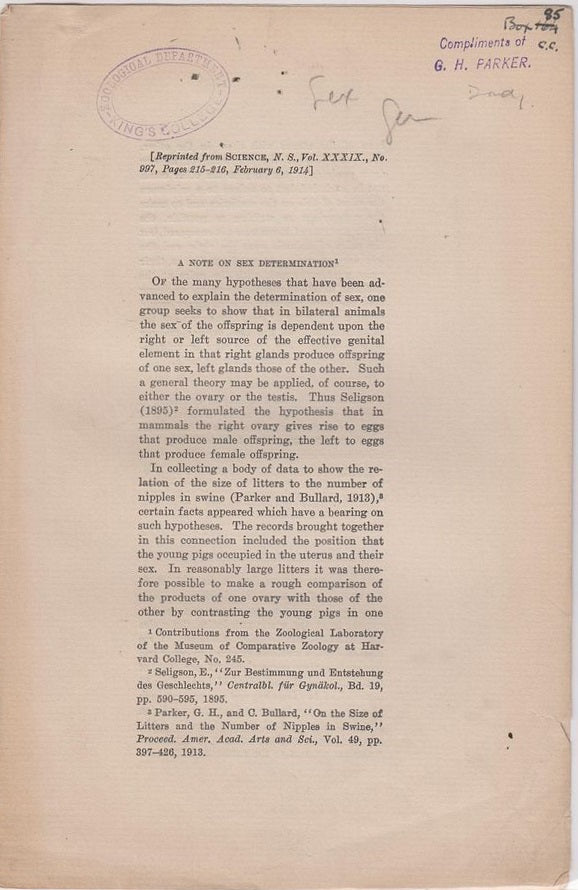 Description 1914. Reprinted from Science NS Vol. XXXIX, No. 997. Osnwerhips stamp of Kings College Zoological Dept. Compliments stamp of GH Parker. First separate edition. Offprint, Original wrappers. *