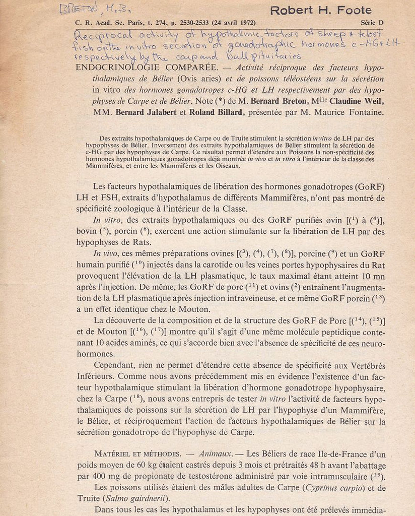 Activite reciproque des facteurs hypothalamiques de Belier (ovis aries) et de poissons teleosteens sur la secretion in vitro des hormones gonadotopes c-HG et LH respectivement par des hypophyses de carpe et de Belier |