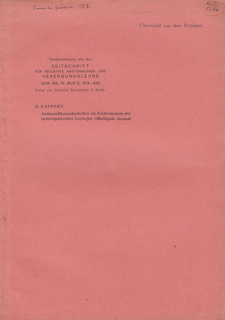 Description Very good condition. First edition. Offprint. Original wrappers. Zeitschrift fur Inkuktive Abstammungs und Vererbungslehre, 1940, Vol. 78, No. 2, pp. 273-293. Science. Genetics. Biology.*