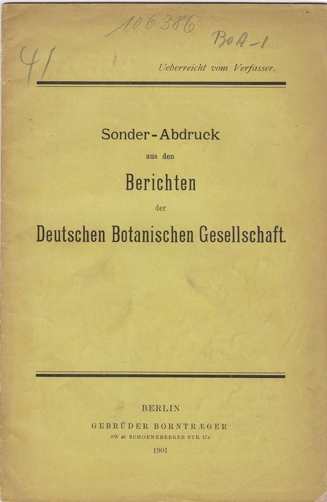 Reprinted from Berichten der Deutschen Botanischen Gesellschaft Band XIX Heft 6, 1901. First separate edition. Offprint. Original wrappers.* |