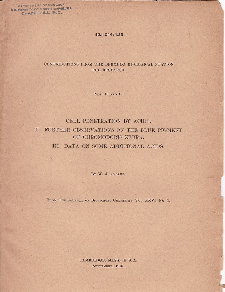 Title Cell penetration by acids. II. Further observations on the Blue Pigment of Chromodoris Zebra. III. Data on some additional acids