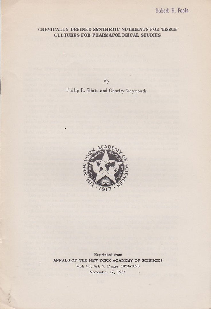 Chemically Defined Synthetis Nutrients for Tissue Cultures for Pharmacological Studies |