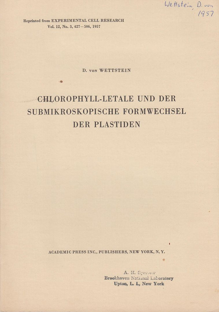 Very good condition. First edition. Offprint. Original wrappers. Name stamp of A.H. Sparrow on front cover. Experimental Cell Research, Vol. 12, No. 3, pp. 427-506, 1957. Science. Biology.* |