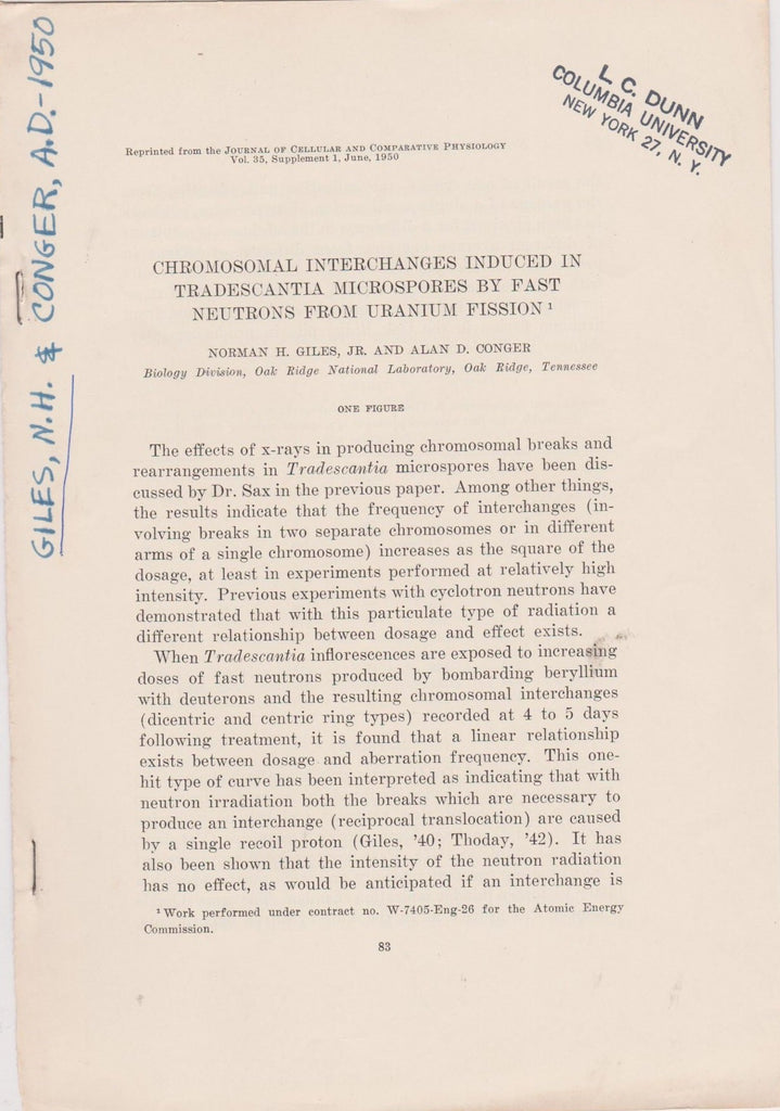 1950. Rperinted from the Journal of Cellular and Comparative Physiology, Vol. 35, Supplement 1, pp. 83-88.Ownership stamp: L.C. Dunn. First separate edition. Offprint. Original wrappers. * |