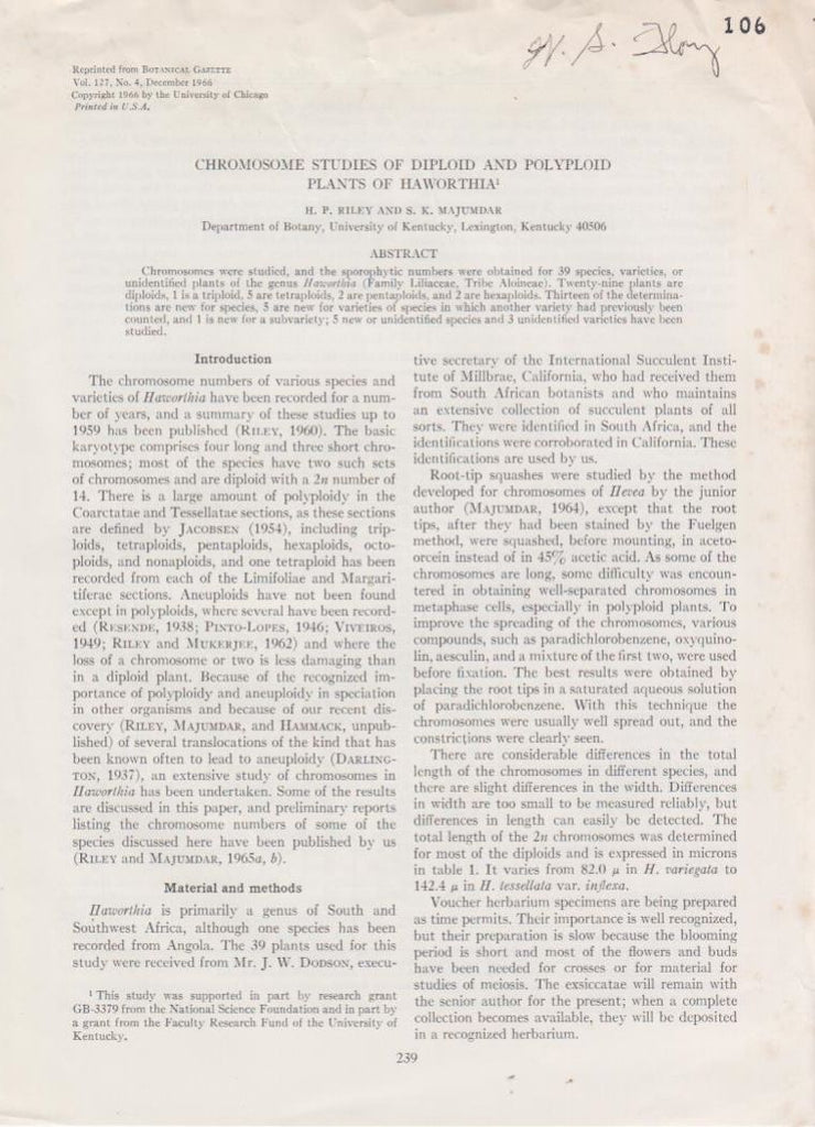 Chromosome Studies of Diploid and Polyploid Plants of Haworthia |