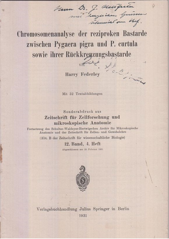 Reprinted from Zeitschrift fur Zellforschung und Mikroskpische Anatomie. 12. Band, 4. Heft. 1931. First separate edition. Offprint. Original wrappers. * |