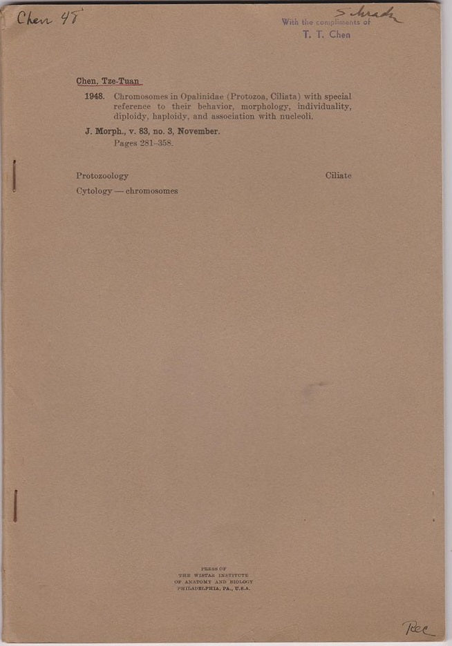 Description 1948. Reprinted from Journal of Morphology, Vol. 83, No. 3, pp. 281-357. Ownership signature: Franz Schrader. Gift stamp from T.T. Chen. First separate edition. Offprint. Original wrappers. *