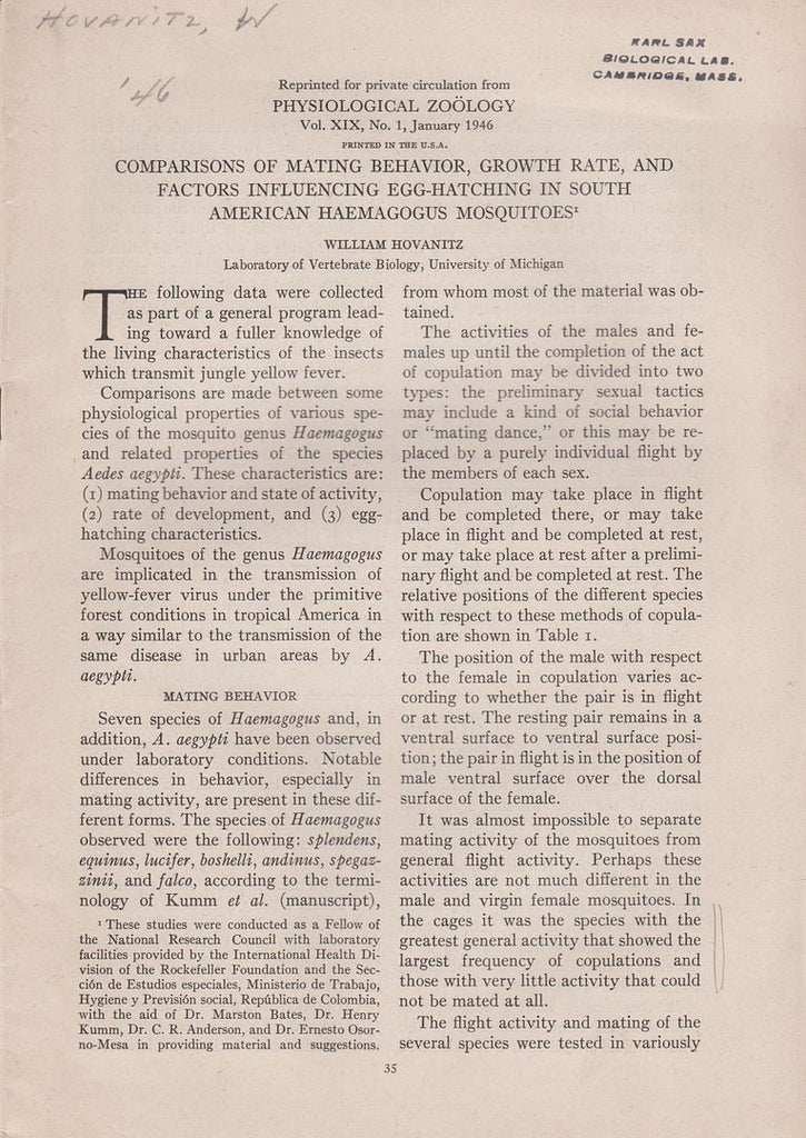 Publisher Physiological Zoology, Vol. XIX, No. 1, January 1946, pp. 35-53