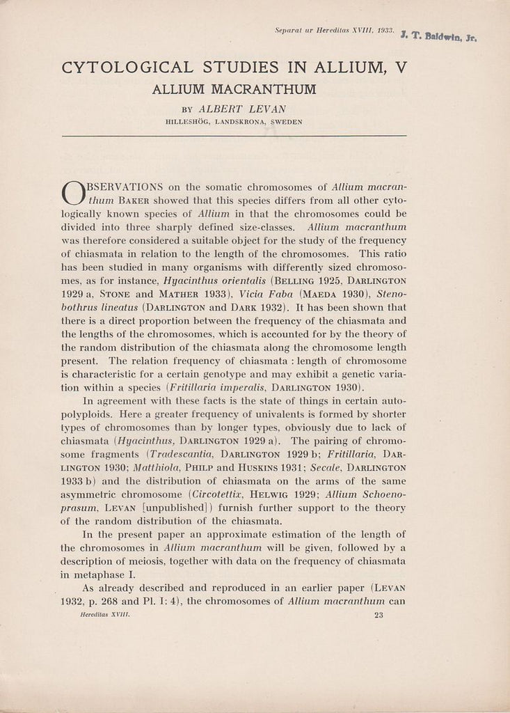 Very good condition. First edition. Offprint. Original wrappers. Name stamp of J.T. Baldwin, Jr. on title page.* Genetics. Science. |