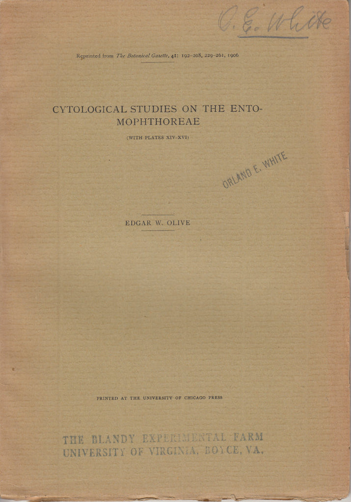 First edition. Offprint. Original wrappers. Reprinted from The Botanical Gazette, 41: 192-208, 229-261, 1906. Ownership stamp and signature from Orland E. White front cover, ownership stamp front cover from the Blandy Experimental Farm. Pages uncut, edges torn and chipped else very good * |