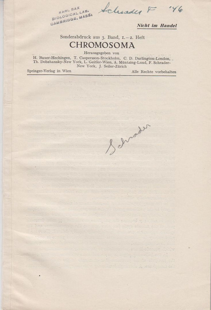 Description Very good condition. Chromosoma, Vol. 3, No. 1-2, 1946, pp. 22-47. First edition. Offprint. Original wrappers. Name stamp of Karl Sax on outside cover. Science. Genetics.*