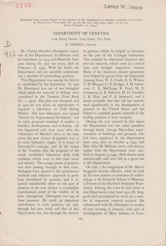 Publisher Annual Report of the Director of the Department of Genetics, Carnegie Institution of Washington Year Book No. 43, for 1943-1944, pp. 103-114, Dec. 15
