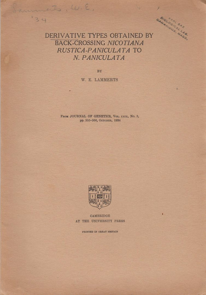 Description Very good condition. First edition. Offprint. Original wrappers. Name stamp on front cover. Journal of Genetics, Vol. XXIX, No. 3, pp. 355-366, October 1934. Science. Botany. Genetics.*