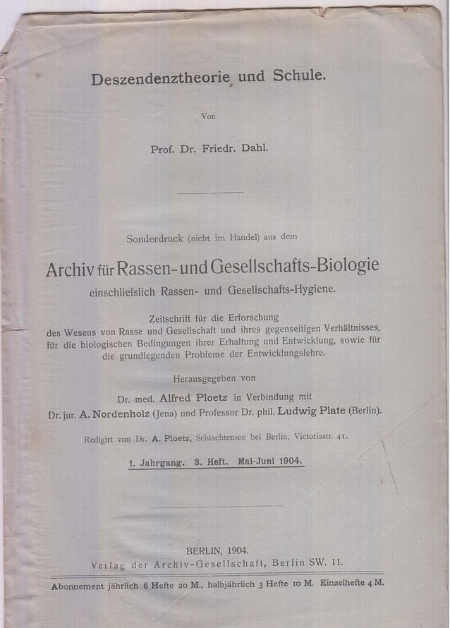 Archif Fur Rassenund Gesellschafts-Biologie. 1 jahrgang. 3. Haft. Mai-Juni 1904 First separate edition. Offprint. Original wrappers. * |