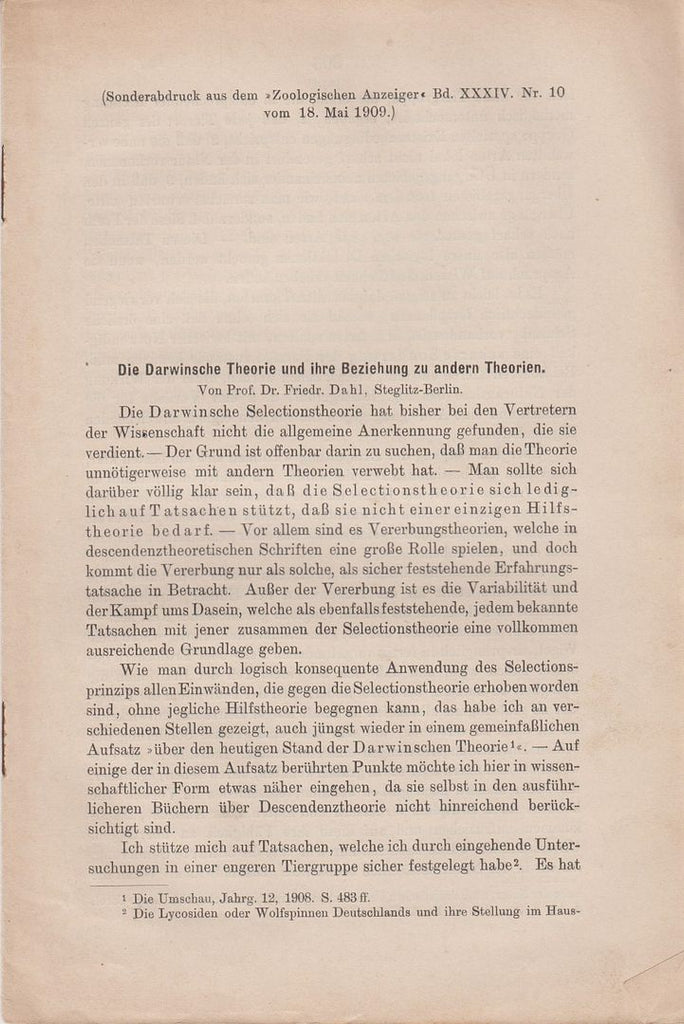 Very good condition.* Evolution. Zoology. "Karl Friedrich Theodor Dahl (June 24, 1856 in Rosenhofer Brök north of Dahme, Holstein ? June 29, 1929 in Greifswald) was a German zoologist, and in particular an arachnologist." Wikipedia |