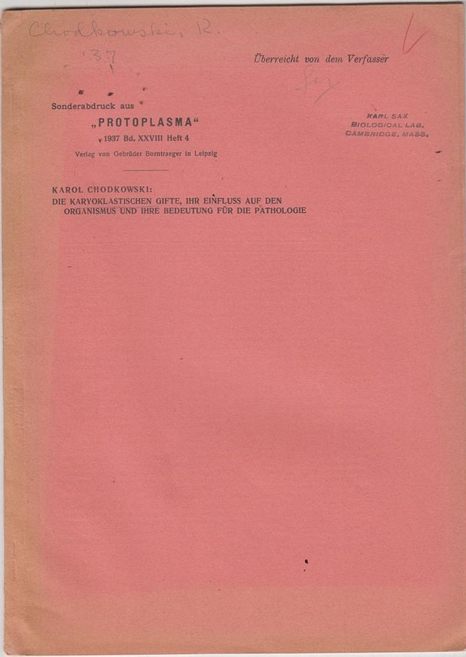 Reprinted from Protoplasma Bd. XXVIII Heft 4, 1937. Previous name stamp of Karl Sax. First separate edition. Offprint. Original wrappers.* |