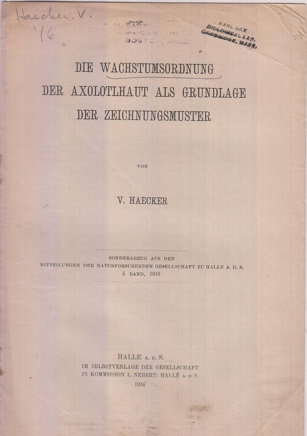 Reprinted from Mittelungen der Naturforschenden Gesellschaft zua Halle ADS, 4 Band, 1916. Ownership stamps of EM East and Karl Sax. First separate edition. Offprint. Original wrappers. * |