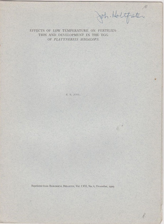 Description 1929. Reprinted from Biological Bulletin, Vol. LVII, No. 6. Ownership signature: Johannes Holtfreter. First separate edition. Offprint. Original wrappers. *