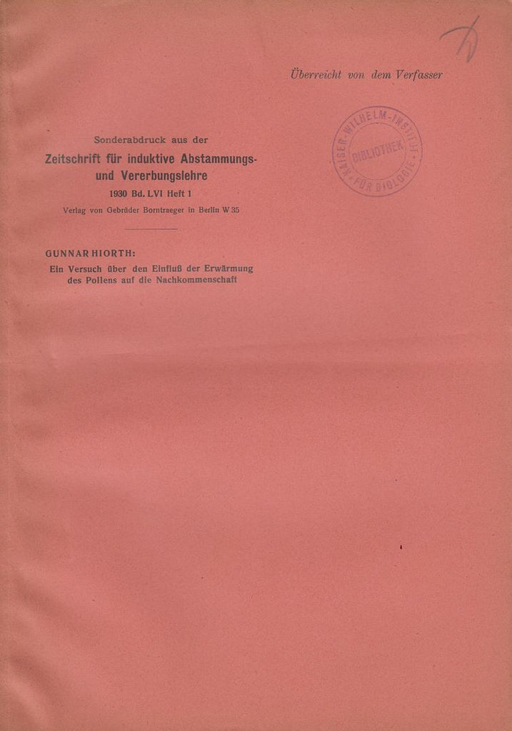 Description Very good condition. First edition. Offprint. Original wrappers. Zeitschrift fur Induktive Abstammungs und Vererbungslehre, Vol. LVI, No. 1, 1930. Institution stamp on front cover. Science. Biology.*