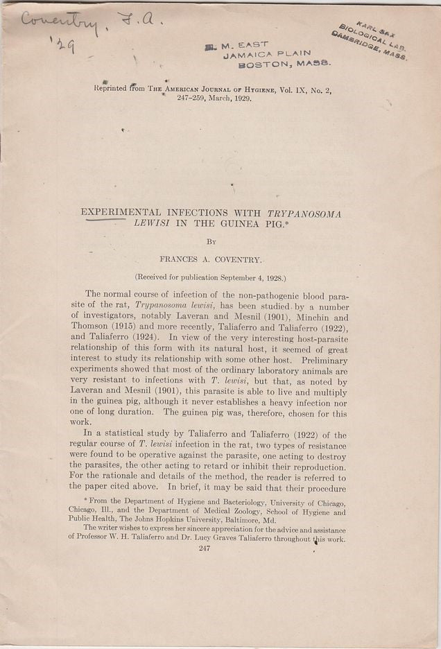Reprinted from The American Journal of Hygiene Vol. IX No. 2, 1929. Previous name stamp in E.M. East and K. Sax. First separate edition. Offprint. Original wrappers.* |