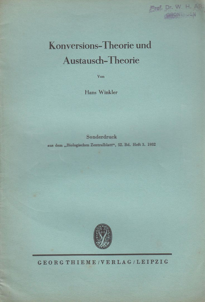 Biologischen Zentralblatt, Vol. 52, No. 3, 1932, pp. 163-189 Prior owner's stamp front cover, else very good. "Hans Karl Albert Winkler (23 April 1877 - 22 November 1945) was a German botanist. He was Professor of Botany at the University of Hamburg, and a director of that university's Institute of Botany. He is remembered for coining the term 'genome' in 1920,[1] by making a portmanteau of the words gene and chromosome." Wikipedia Science. Biology. Medicine. Genetics. * |