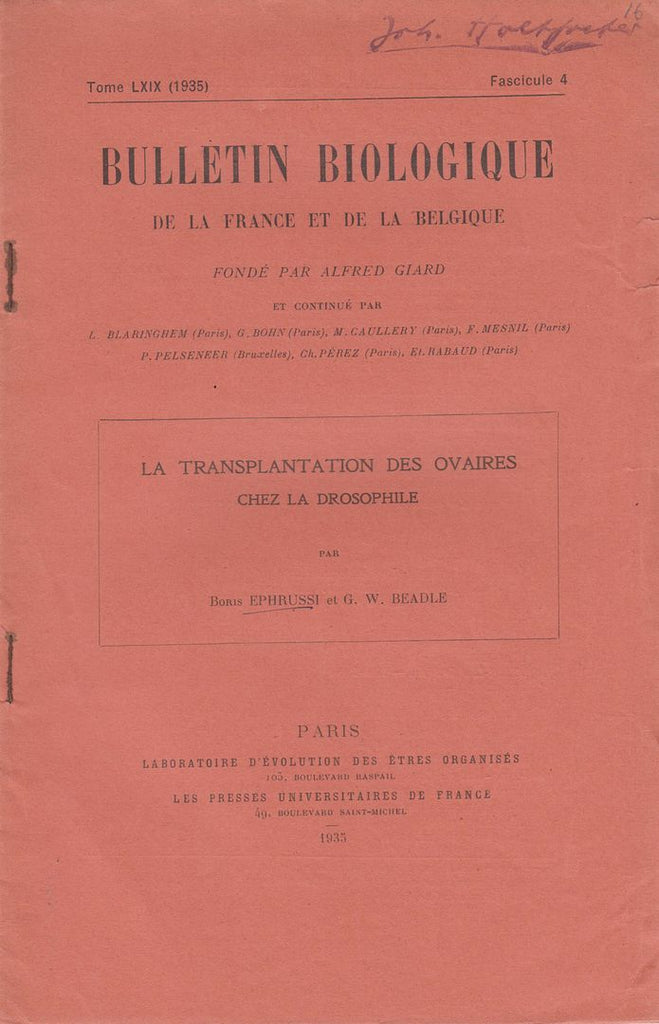 Description Bulletin Biologique de la France et de la Belgique, Vol. LXIX, No. 4, 1935, pp. 492-502. Very good condition.* First edition. Offprint. Original wrappers. G. W. Beadle was awarded the Nobel Prize in Physiology or Medicine in 1958.