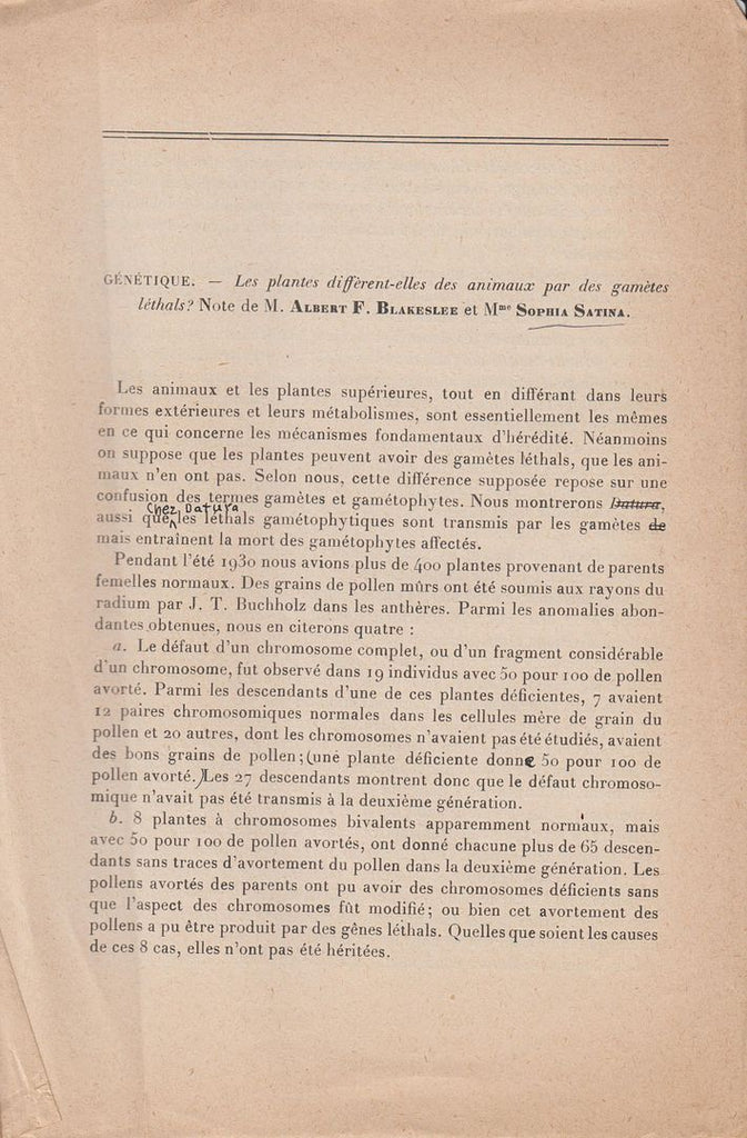 Very good condition. First edition. Offprint. Original wrappers. Comptes rendus des Seances de l'Academie des Sciences, Vol. 198, p. 768, meeting from Feb. 19, 1934. Science. Genetics. Botany. Tears in spine.* |