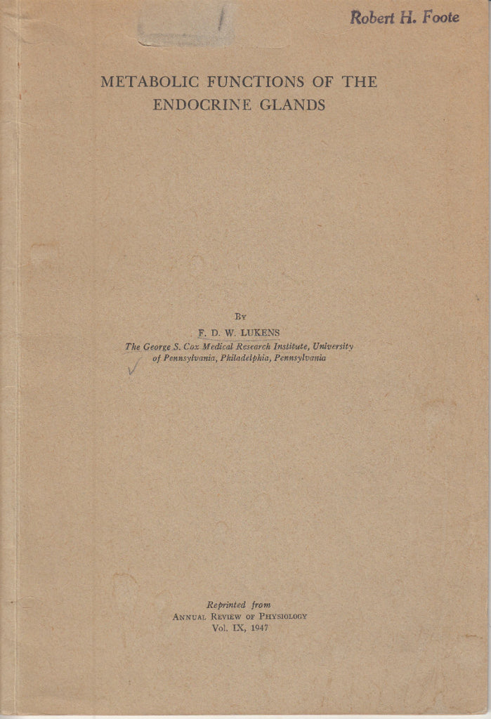 Description First edition. Offprint. Original wrappers. Reprinted from the Annual Review of Physiology Vol. IX, 1947. Ownership stamps from Robert H. Foote front cover and title page. Few smudges front and rear cover else very good *