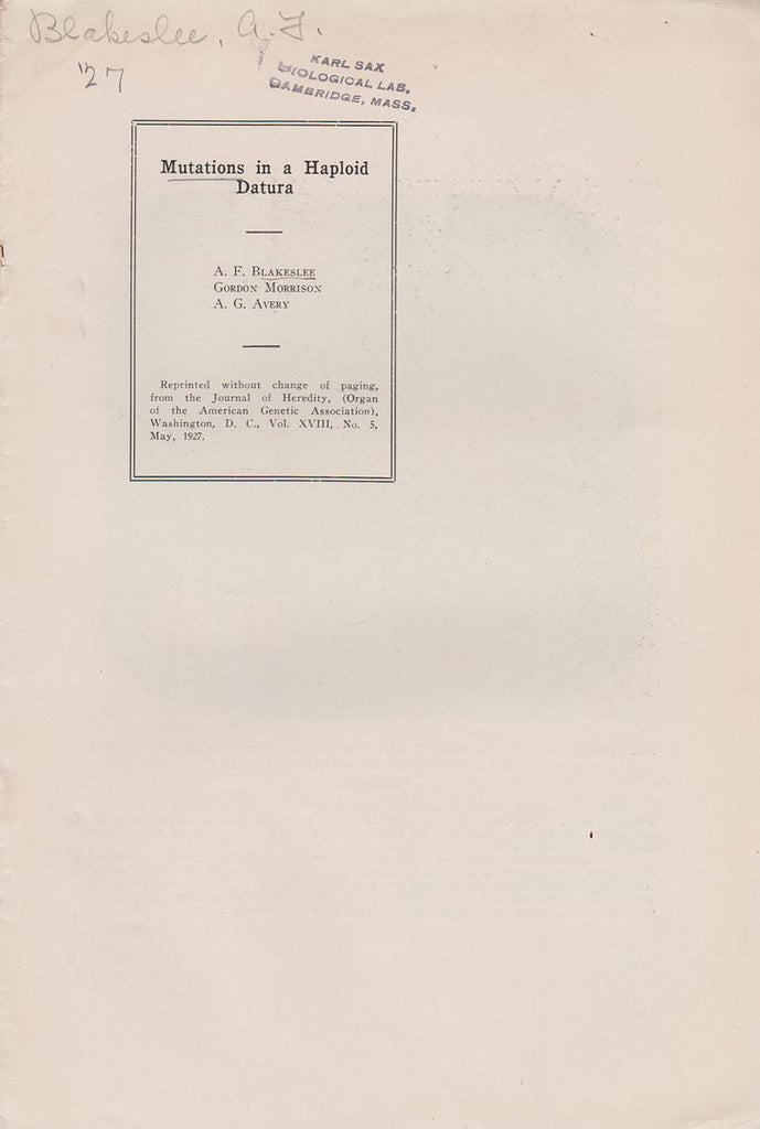 Very good condition. First edition. Offprint. Original wrappers. Name stamp of Karl Sax on front cover. Science. Genetics. Botany. Staples are rusted.* |