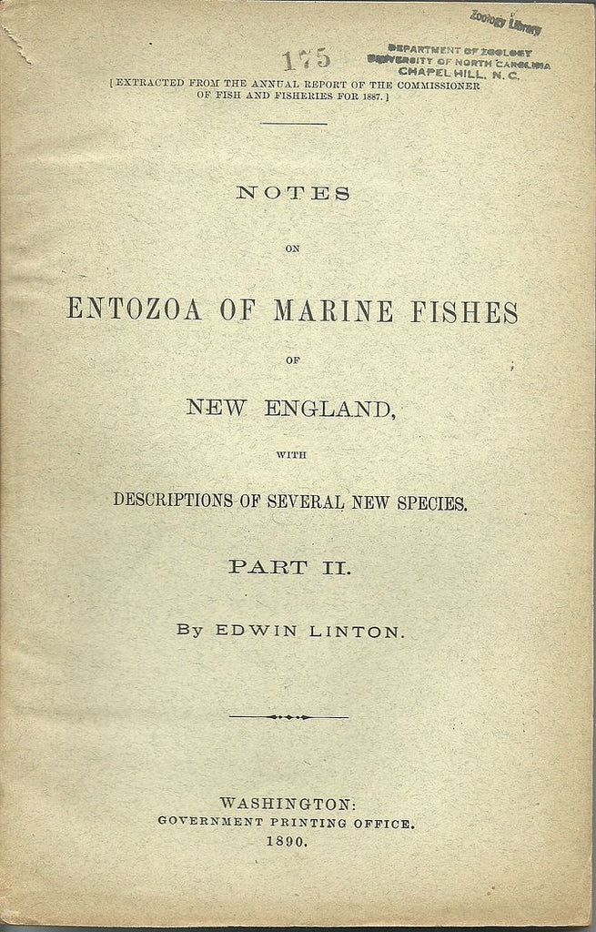 (xi, pages 719-899 pages, XV plates). In Report of the Commissioner of Fish and Fisheries for l887. "Dr. Edwin Linton (1855-1939) was an American biologist noted for his research in the field of helminthology, the study of worms, especially parasitic worms in fishes." Wikipedia. Slight tear front cover, institute stamp front cover, pages little brown else very good. * 19th Century science. Science. Biology. * |