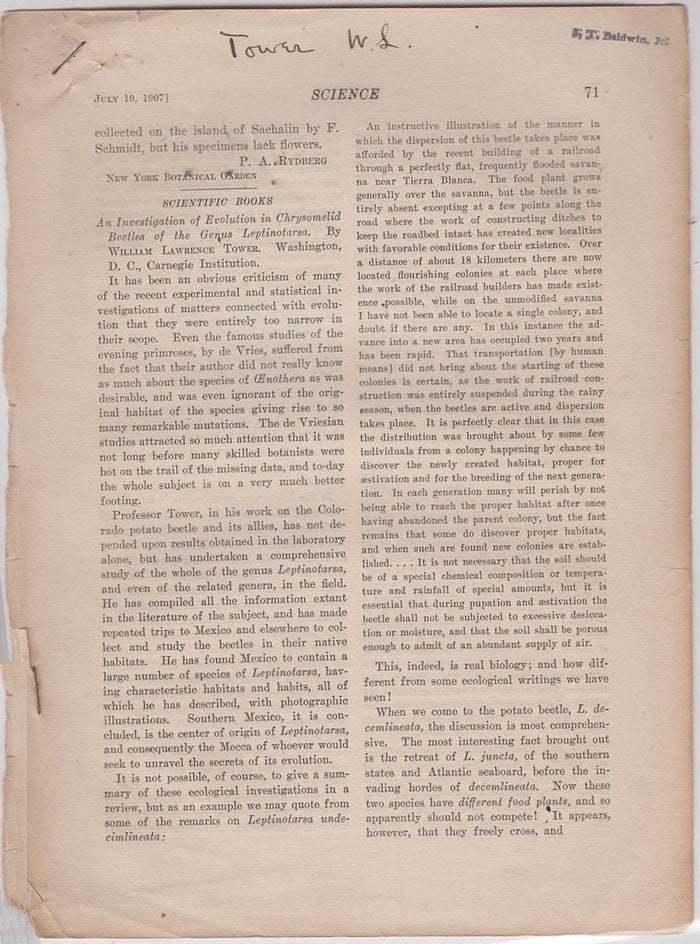 1907. Reprinted from Science NS.Vol XXVI, No. 655. Ownership stamp of JT Baldwin. First separate edition. Offprint. Original wrappers. * |