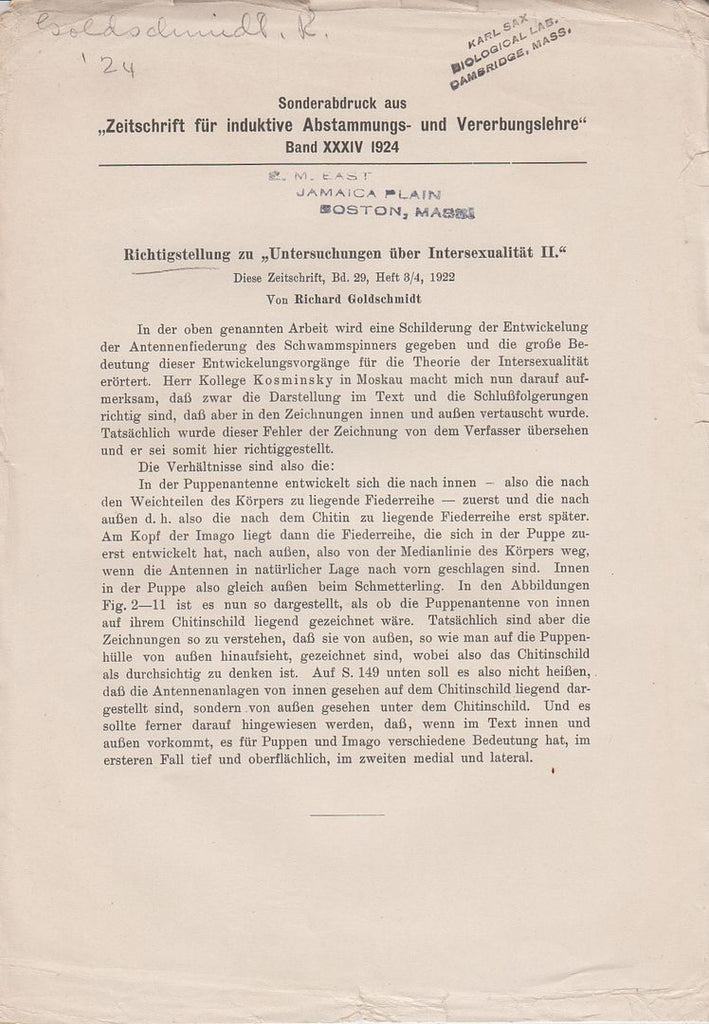 Very good condition. First edition. Offprint. Original wrappers. Ownership stamps of Karl Sax and E.M. East on title page. Science. Biology. Edges are nicked.* |