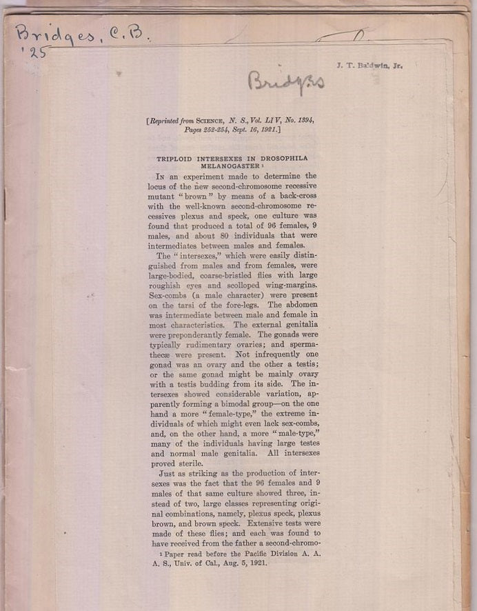 Title Set of six offprints by Calvin B. Bridges 1920-1925