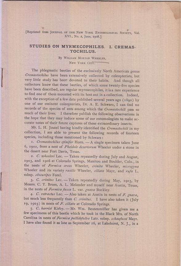 Journal of the New York Entomological Society, Vol. XVI, No. 2, 1908. First separate edition. Offprint. Original wrappers. * |