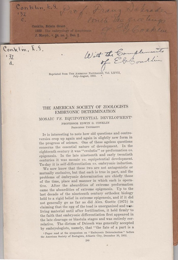 Description 2 offprints included. First: Reprinted from The American Naturalist vol. LXVII, 1933. Second: The Embryology of Amphioxus. Reprinted from J. Morph., vol. 54 no. 1. Both offprints are inscribed presentation copies, signed by the author. First separate edition. Offprint. Original wrappers.*