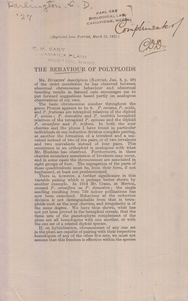 First separate edition. Offprint. Original wrappers. reprinted from Nature, March 12, 1927. Initialed by author with compliments. Karl Sax biological lab stamp. Institution stamp. |