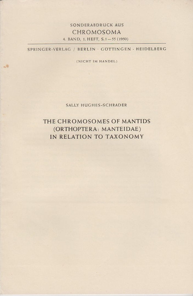 Chromosoma, 1950; 4(1): 1-55 Sally Hughes-Schrader 1895-1984 American zoologist. Spent early days studying insects, then moved to the study of fishes and amphibians. * Science. Zoology. Fine. * Offprint. First edition. |