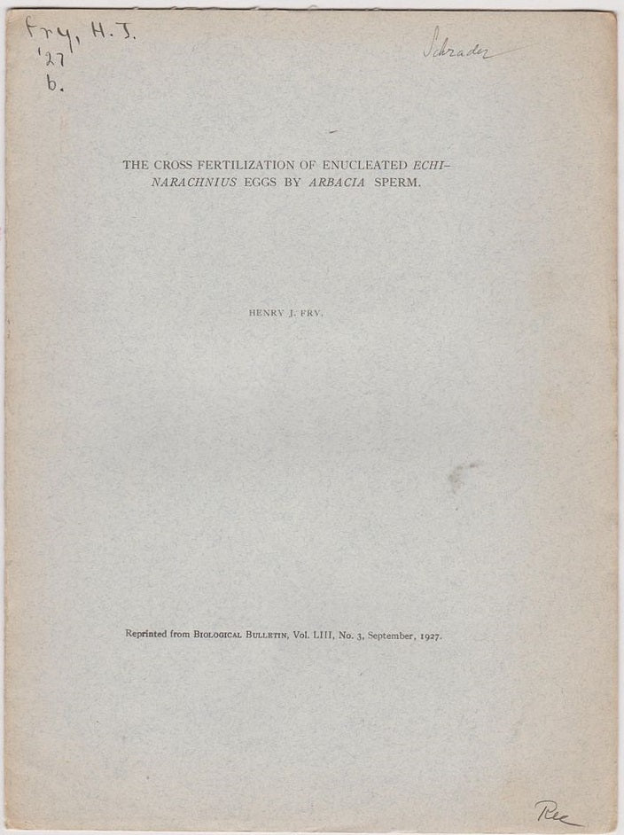 Description 1927. Reprinted from Biological Bulletin, Vol. LIII, No. 3, pp. 173-178. Ownership siganture: Franz Schrader. First separate edition. Offprint. Original wrappers. *