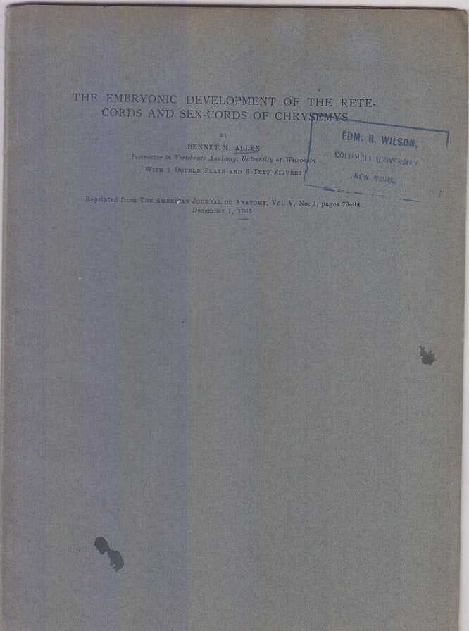 The American Journal of Anatomy, Vol. V, No. 1, p. 9-94. December 1905. Stamp from E.B. Wilson. First separate edition. Offprint. Original wrappers. * |