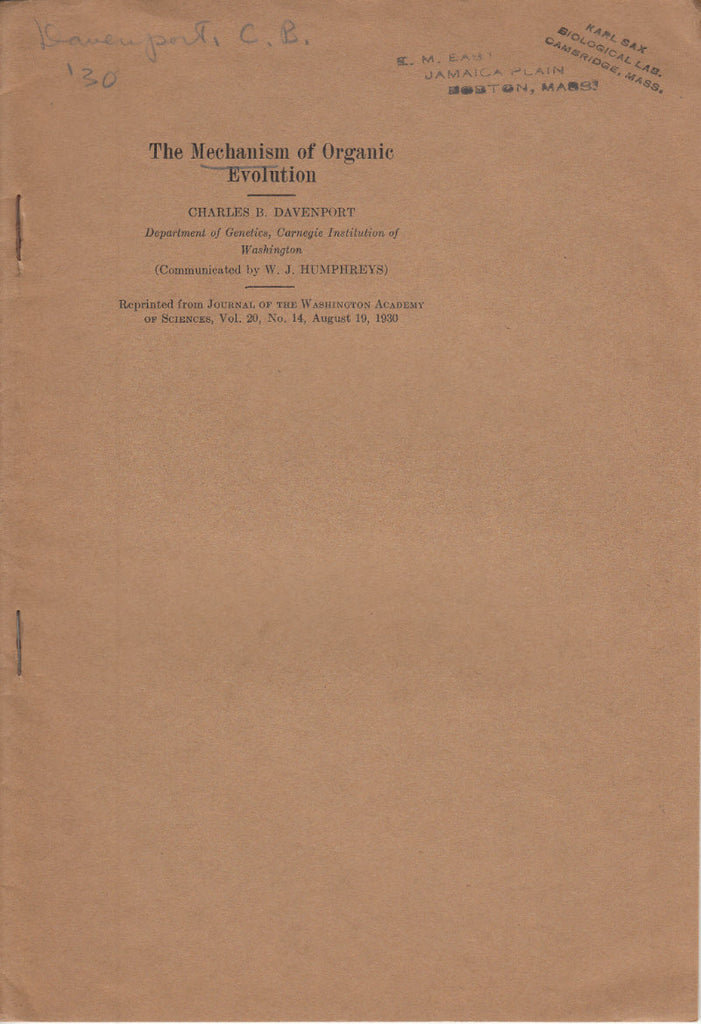 Description First edition. Offprint. Original wrappers. Reprinted from Journal of the Washington Academy of Sciences, Vol. 20, No. 14, August 19, 1930. Ownership stamps from E.M. East and Karl Sax front cover else very good. *