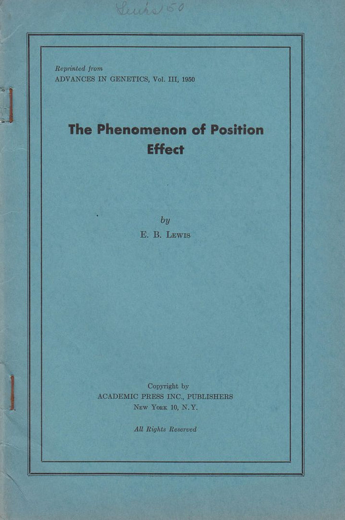 Advances in Genetics, Vol. III, 1950, pp. 73-115. Very good condition.* Staples rusty, some creasing else very good. "Edward B. Lewis (May 20, 1918 ? July 21, 2004) was an American geneticist, a corecipient of the 1995 Nobel Prize in Physiology or Medicine." Wikipedia |