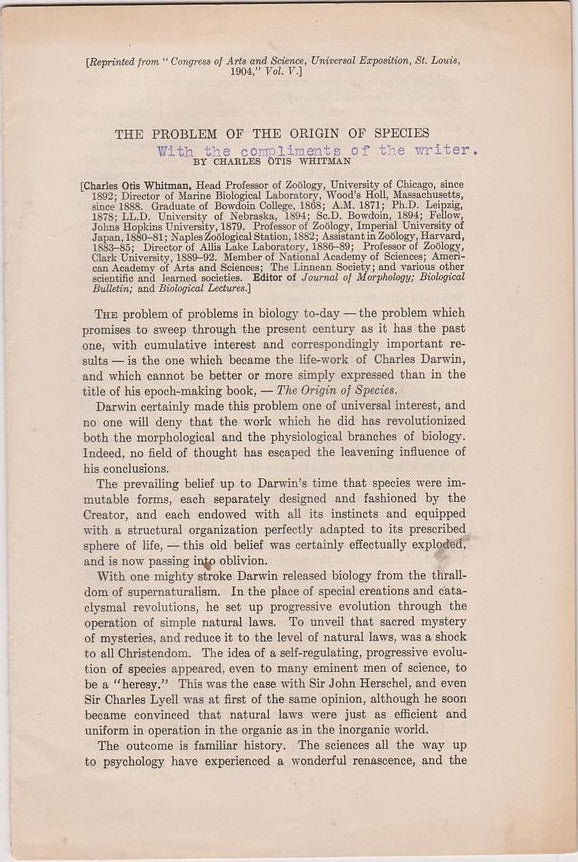 1904. Reprinted from Congress of Arts and Science, Universal Exposition, St Louis, Vol, 4. Gift stamp from author. Ownership stamp: E.B. Wilson. First separate edition. Offprint. Original wrappers. * |