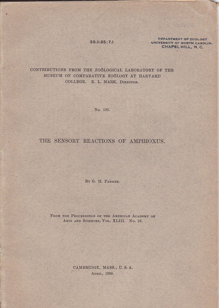 First separate edition. Offprint. Original wrappers. Department of Zoology stamp on front cover. Complements of G. H. Parker stamp on front cover. "From the Proceedings of the American Academy of Arts and Sciences, vol. XLIII, no. 16." "April 1908." pages [415]-455 ; 25 cm. |