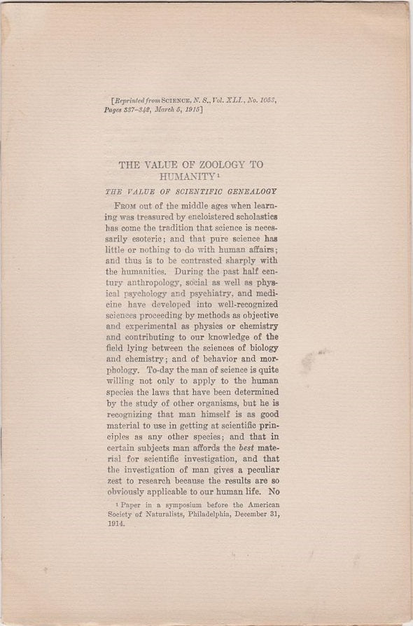 Description 1915. Reprinted from Science, N.S., Vol. XLI, No. 1053, pp. 337-342. First separate edition. Offprint. Original wrappers. *